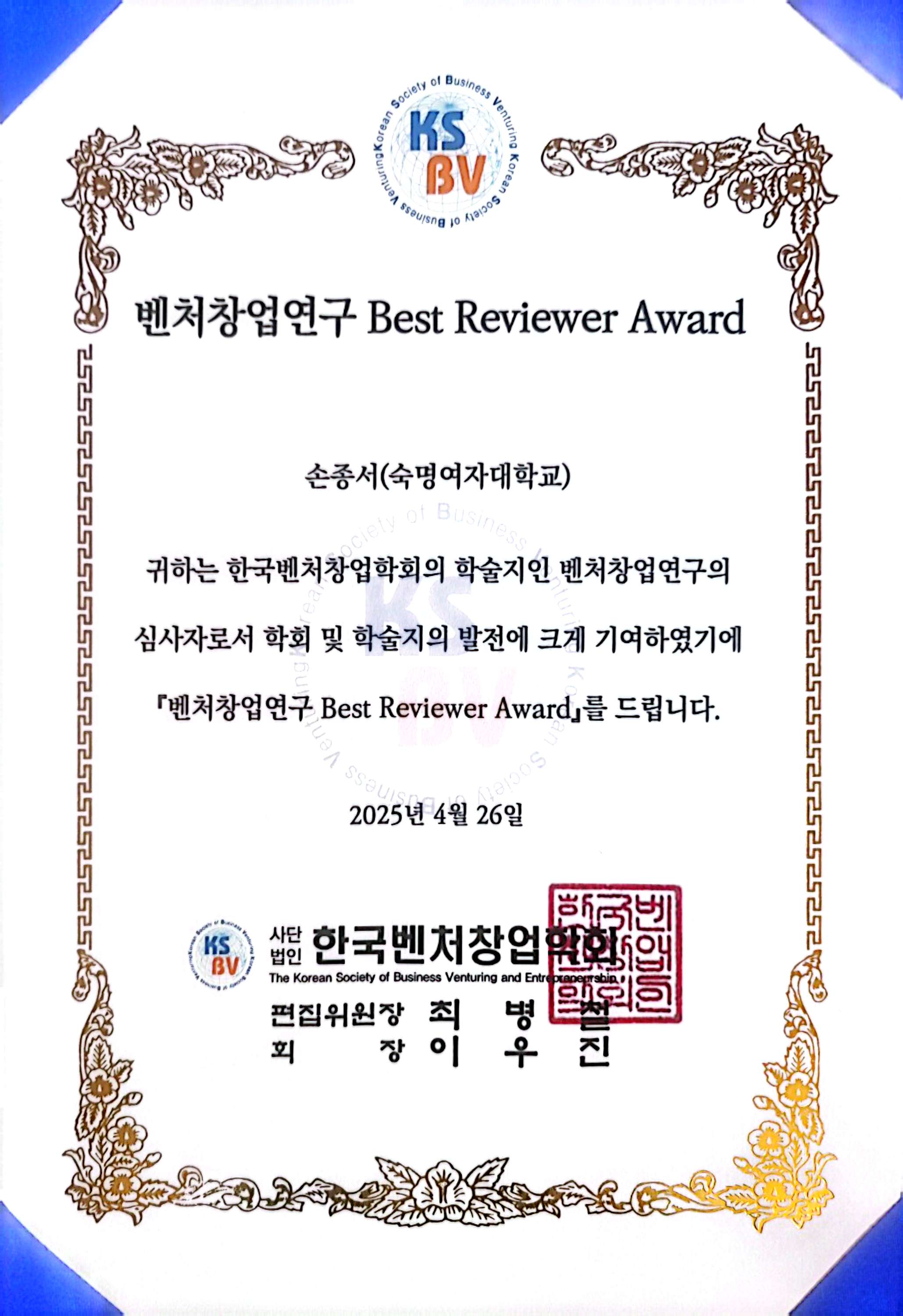 [홍보] 앙트러프러너십전공 손종서 교수 학술지 '벤처창업연구' Best Reviewer Award 수상