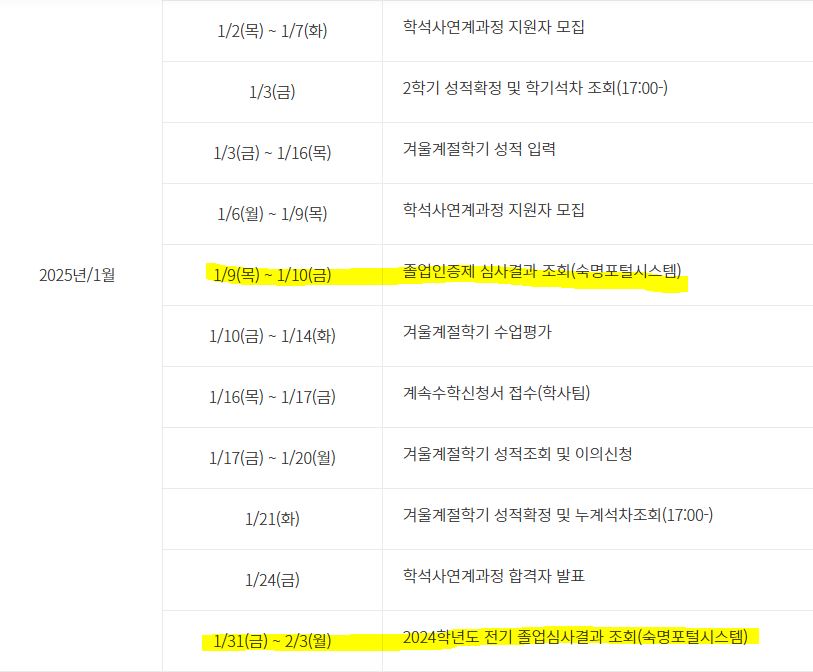 이를 토대로 최종 졸업심사결과 조회는 *2025.1/31-2/3에 확인 가능합니다.
