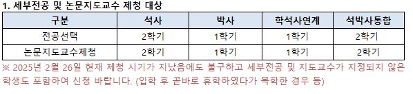 2025학년도 1학기 일반대학원생의 세부전공 선택과 논문지도교수 제청을 아래와 같이 진행하여 주시기 바랍니다.