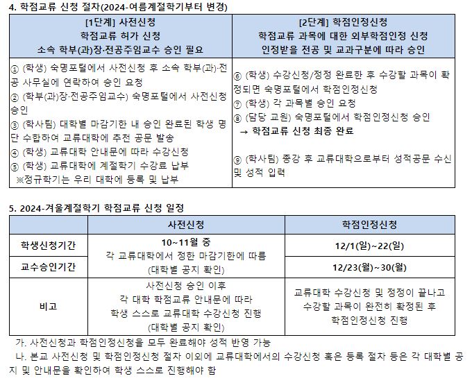 교무처 학사팀에서는 2024학년도 겨울계절학기 학부생의 국내 대학 학점교류를 아래와 같이 시행하고자 합니다.