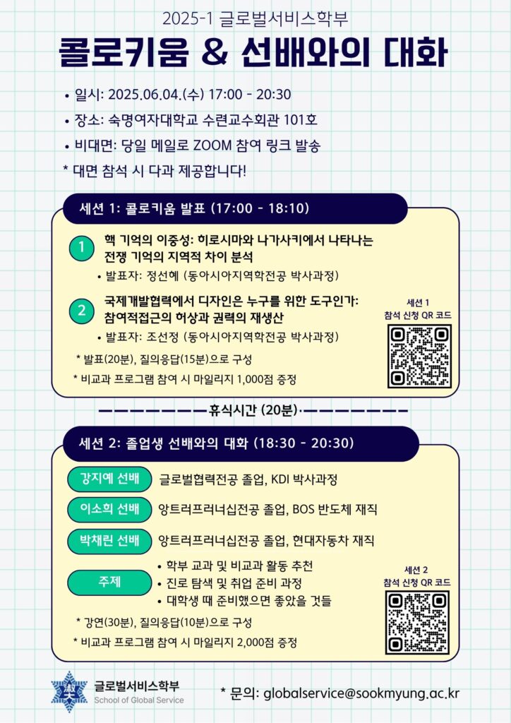 [글로벌서비스학부] 2025학년도 1학기 콜로키움 & 졸업생 선배와의 대화 행사 참석 모집